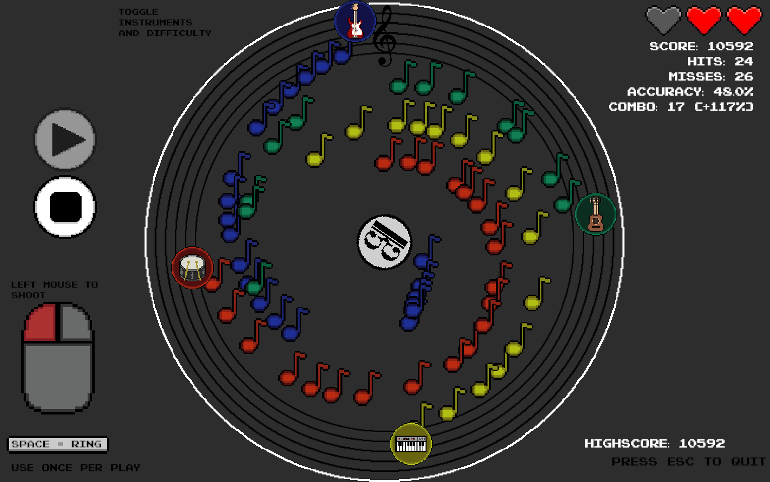 Shoot with left mouse, press spacebar for a single ring of destrution.